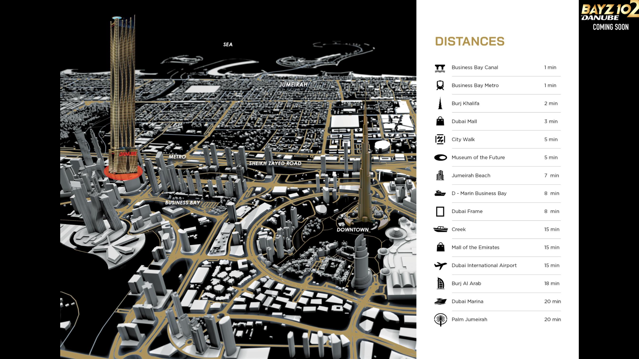 How far is Bayz 102 from major attractions?